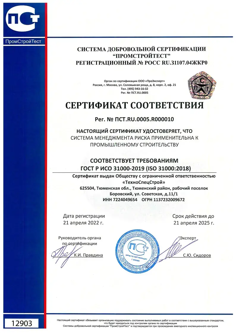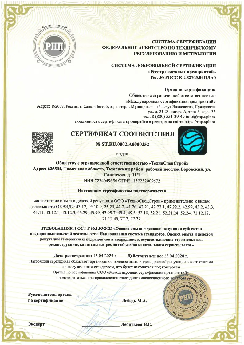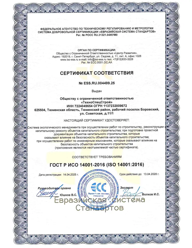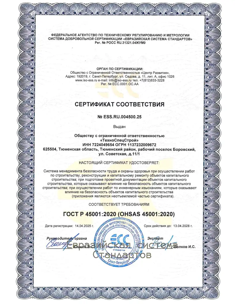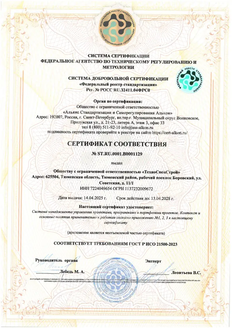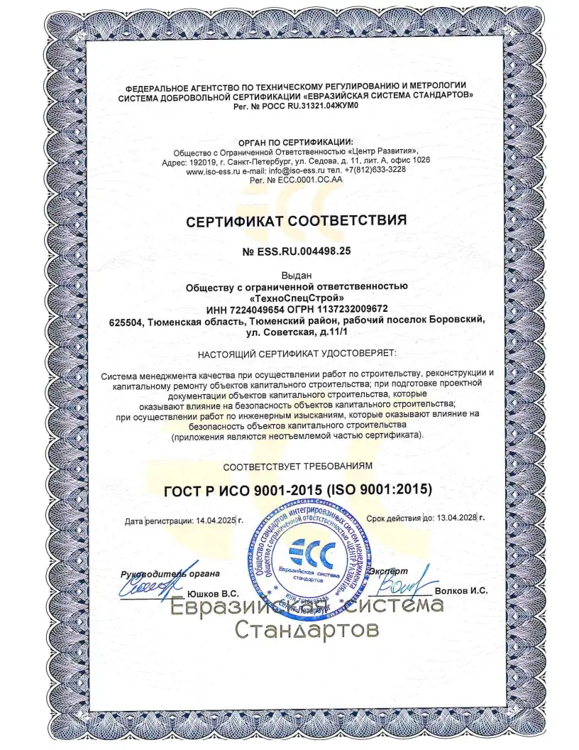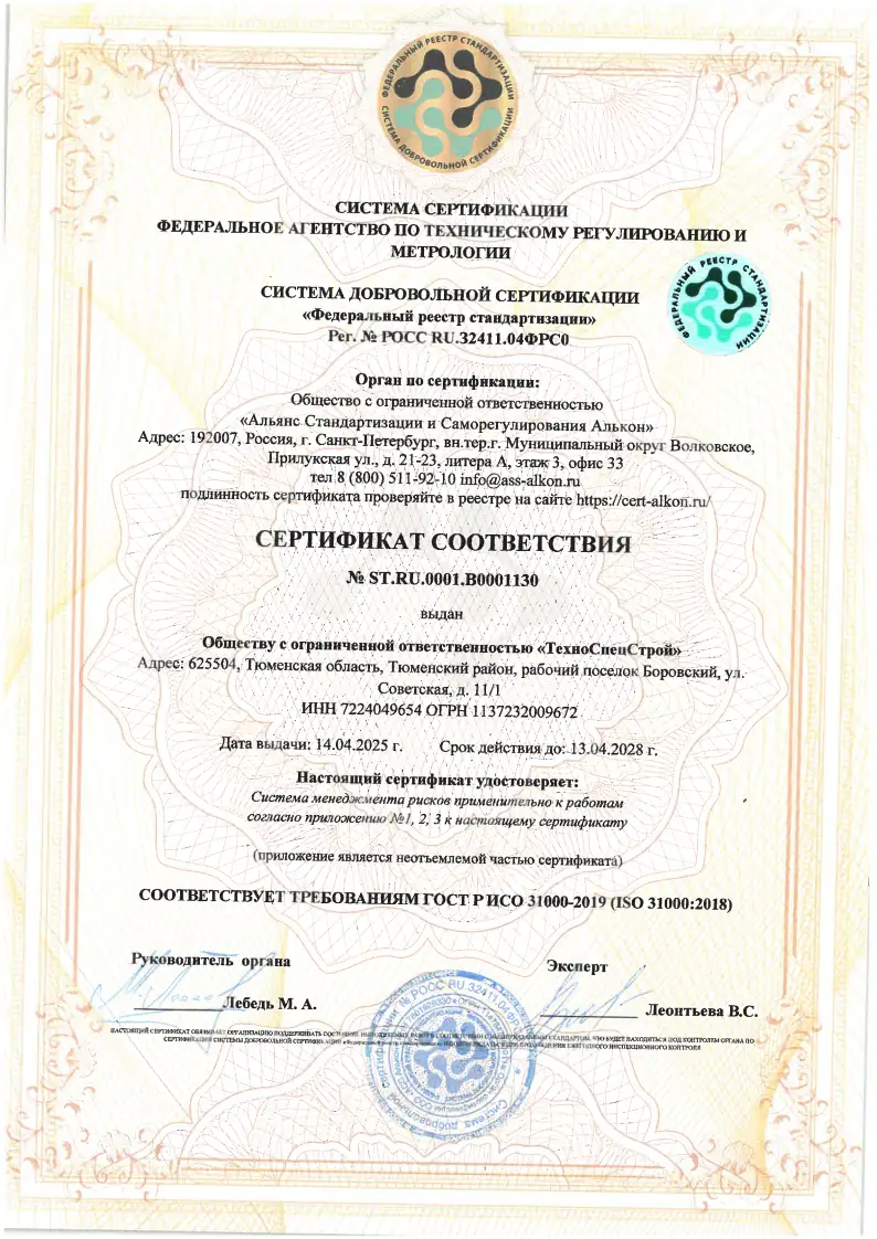 В ООО «ТехноСпецСтрой» действует интегрированная система менеджмента, включающая систему менеджмента качества (СМК), систему управления охраной труда и систему экологического менеджмента. Политика СМК определяет ключевые аспекты обеспечения качества, охраны труда и охраны окружающей среды. Позволяет обеспечивать конкурентоспособность, как на российском, так и на международных рынках.